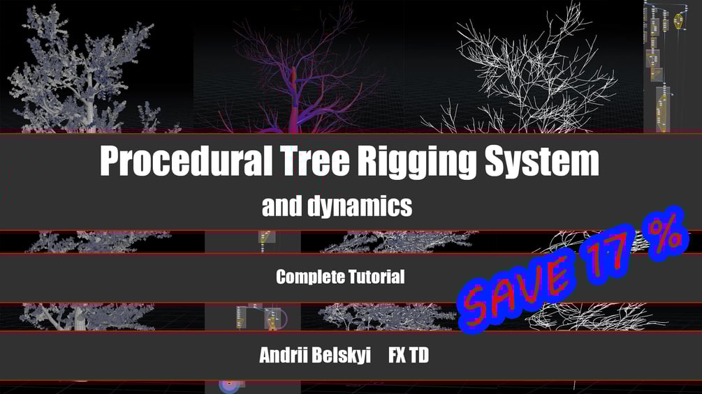 In this tutorial I will show you how to create procedural tree rigging system for any tree model. Apply dynamics with wire solver, procedural setup of the wires and constrains. Create non-simulation wind system and growth setup, working real-time. Few methods of the capturing geometry, fix problems with branch connections. We will simulate our leaves add custom fake wind rotations on it.